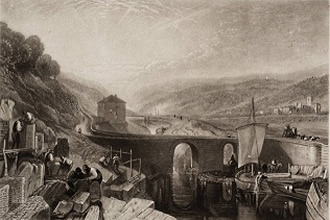 The Bridgewater canal, built by the Duke of Bridgewater (who had been inspired by the ’Canal du Languedoc’ - ’Canal des Deux Mers’ or ’du Midi’ - while on his Grand Tour), to bring coal from his mines at Worsley to Manchester, later extended to the river Mersey in order to reach Liverpool (a harbour); the price of coal was halved, and industry prospered in Manchester.