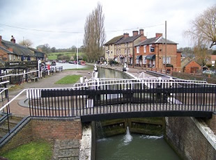 - The lock at Stoke Bruerne; the last house on the right bank in the middle of the photo is now the Canal Museum
