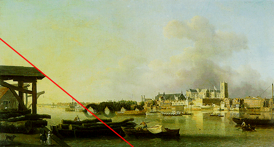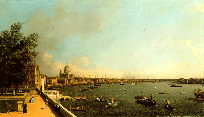 From the terrace of Somerset House, St Paul’s appears just above the margin between the Thames and houses (even in the 18th century, before the building of the Embankment) whereas in the painting, St Paul’s appears above an expanse of water, as if the view were taken from further upstream after the curve of the Thames (as in Canaletto’s earlier view from Richmond House) ; the effect is emphasized by the highlights on the water. This causes an oscillation between two points of view in the spectator’s eye.