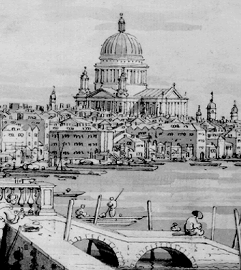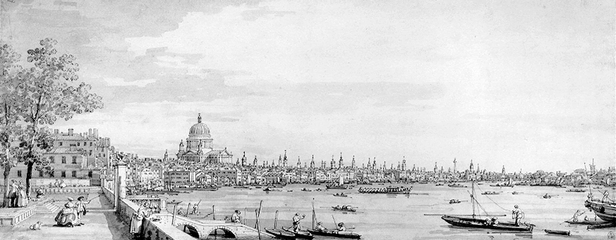 In the Courtauld drawing, the low wall along the terrace makes a small angle with the vertical (about 35°), supposing the spectator close to it and to the woman bending over it; the West front of St Paul’s is seen obliquely in foreshortening.