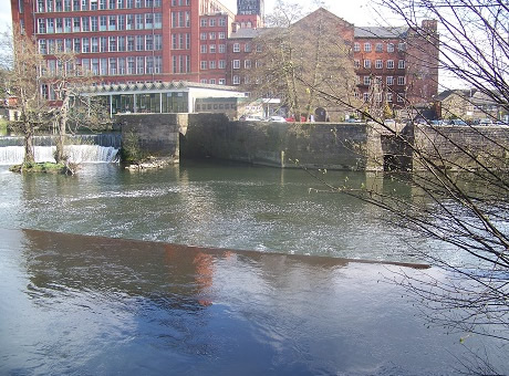 The Derwent from the Mill, upstream, showing the weirs and the steep slope from the hills providing sufficient force to drive the machinery - the steepness of the valley may be estimated from the format of the photo, a vertical panoramic view stitching three shots.