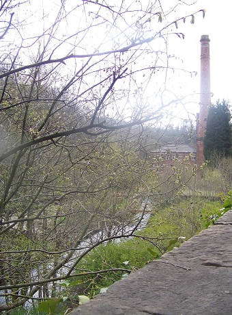 The First mill was built with a width corresponding to the largest beams which could cover the space for the machinery. The water power used came from Bonsall brook (partly under culverts), and a stream formerly used by lead mines; the level was raised to have ’overshot wheels’ (= wheels driven by water falling over them, which makes for a stronger current, not running under them).