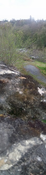 Two views from within the site, one (far left) towards the First Mill showing one of the weirs, and the other (left) in the opposite direction towards the Second Mill, showing the uses of streams.