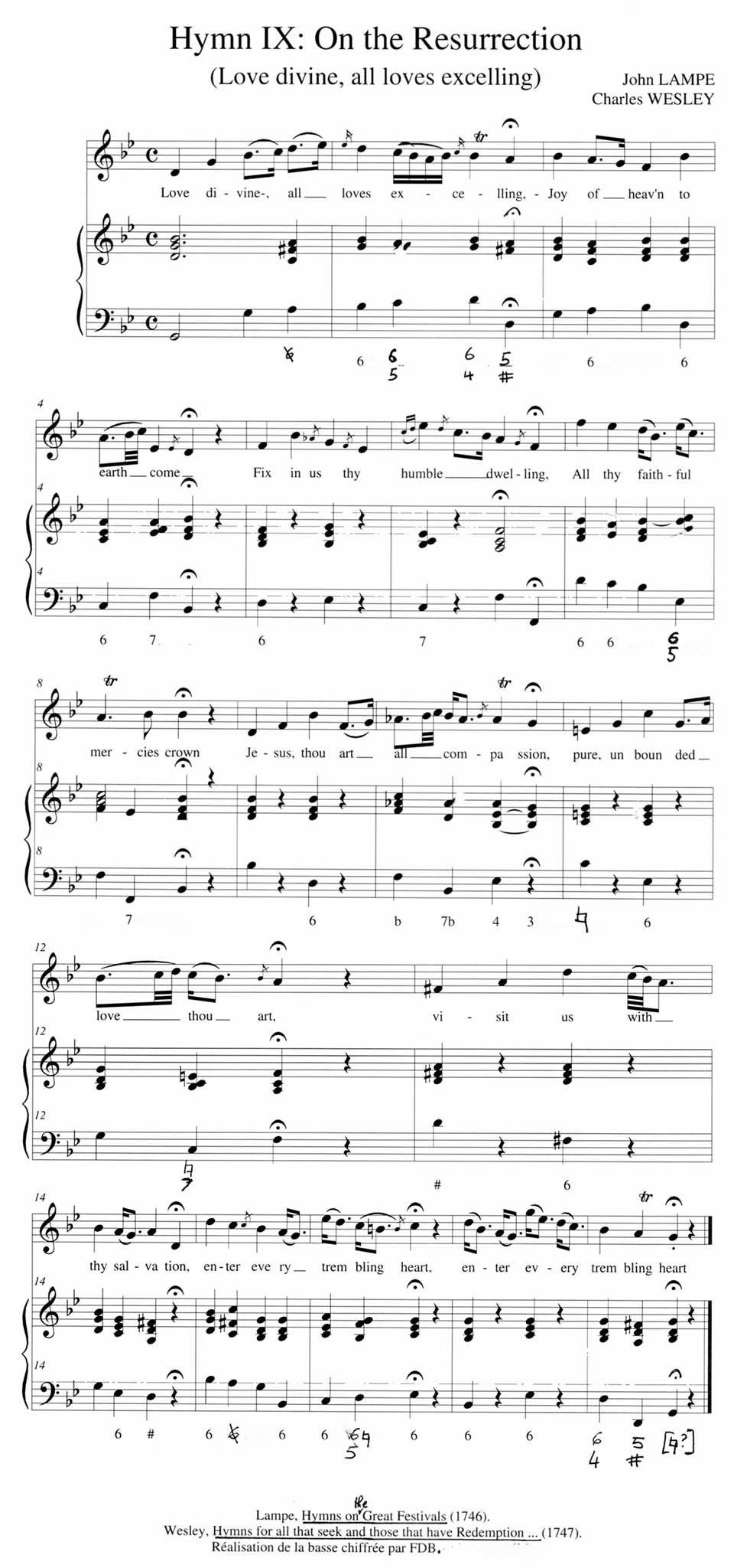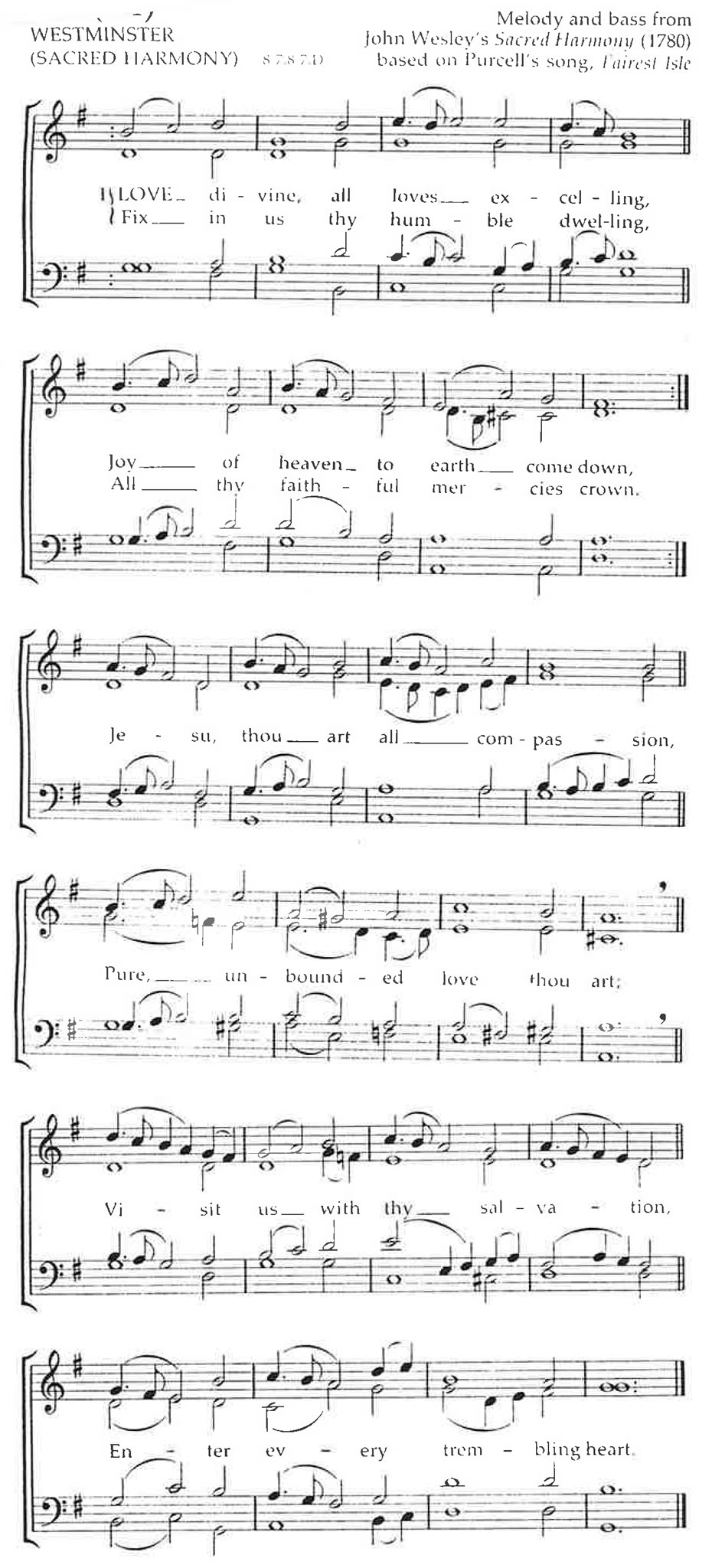Over the years, both text and music underwent many changes, so that twentieth-century books do not print hymns exactly as they were originally written in the eighteenth century. One of the most obvious examples of such textual and musical instability is to be found in Love divine, all loves excelling....