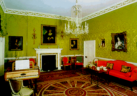 The drawing room, on the first floor, with a 1798 fortepiano. The sofa, the armchairs and the teatable are by Hepplewhite (1765 to 1780). The furniture on either side of the fireplace is by Sheraton (1795).