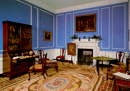 The study, which has been restored with hangings in «Zoffany blue» after one of his «conversation pieces».