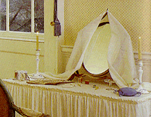 The mirror is covered with veils, as in the bedroom of Number One in Bath.