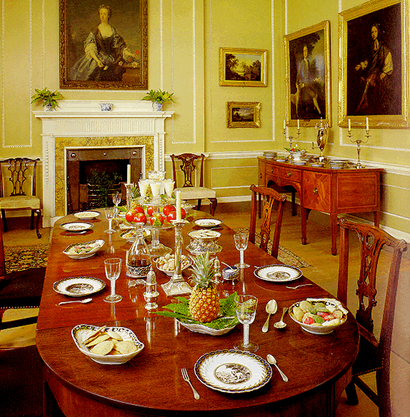 The dining room, on the gound floor, with a mahogany table and a set decorated with Aesop’s fables . Some paintings are classical landscapes (a Swanevelt), others are Georgian portraits.