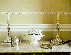 To the left of the entrance, the dining room has been recreated at the moment of the desert, with the table-cloth removed and fruits and sweets displayed on the mahogany table.