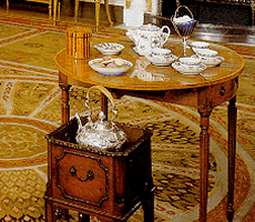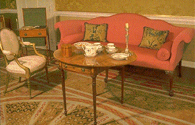 The sitting room is situated on the first floor ; it is the most handsomely decorated room. It is hung with green damask and the Venetian blinds are made in the same material. As the room meant for entertaining guests, it is lit by a crystal chandelier and brackets with candles reflected in the mirrors. It is a room for the ladies, where they play music on the fortepiano (dated 1798), or serve tea on the oval Pembroke table placed in front of the sofa.