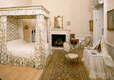 The bedroom to the left of the landing contains a four-poster bed, and a dressing table with veils such as may be seen in Zoffany’s painting representing Queen Charlotte in her Dressing Room.