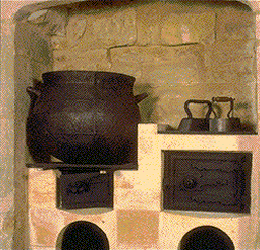 The kitchen is to be found in the basement. It has three arches corresponding to distinct uses: from left to right, providing hot water the the various domestic needs, then in the centre cooking the dishes; the turnspit machinery is kept in motion by a dog in a wheel, under whose paws a burning coal was placed to make him move constantly (Smollett alludes to this cruel custom in The Expedition of Humphry Clinker).