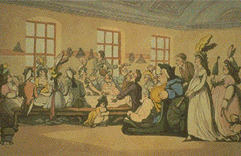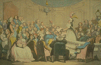 The watercolour evokes the crowded social gatherings, evoked in the novels of Smollett and Jane Austen...
