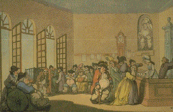 While in Bath in 1792, the artist Thomas Rowlandson (who also made cartoons on London society) painted a series of twelve watercolours published as aquatints, which give a satirical view of various episodes in the life of a visitor “taking the waters”. A gouty character appears in many of the scenes,with his young wife courted by an officer.