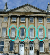 In Lansdown Crescent which has the same arrangement with four windows, the difficulty was avoided replacing the central pillar with a blind niche; though its has the same structural function as the pillar (a projecting element), which is to separate two windows, it has the inverse appearance of being a recess, which corresponds to the opening the eye normally expects in the centre, but, being blind, it is sufficiently different from the windows with which it is meant to alternate.