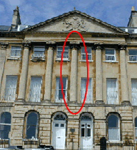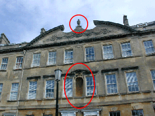 In Camden Crescent, the central pediment has five columns (with one in the centre) surrounding four windows, which is against the rule of having a central window (in an odd number of windows) surrounded by columns (in even number). The same arrangement is to be found in Bedford Square in London.