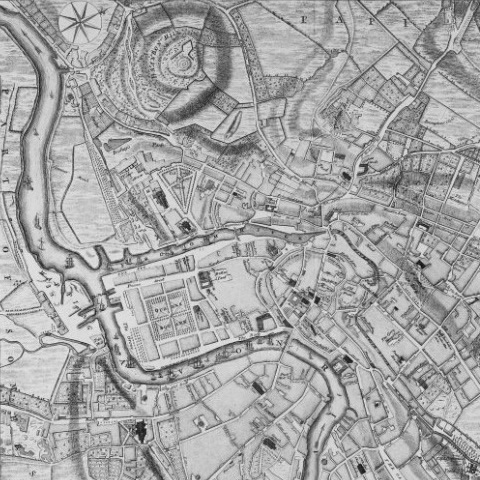- it shows that the area between the Avon and the Frome was largely built: Queen Square, Bristol bridge (the only bridge), the streets around the Exchange;