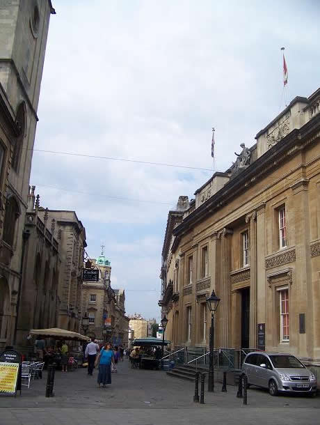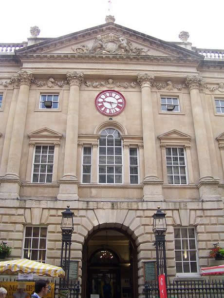 It had banks and trading institutions (right, a view of the business area), with (far right) the Exchange built by John Wood the Elder (the architect of Bath) in 1743; its clock is of a later date - the 1840s, when the railway arrived, and it has two hands to show both local time and ’railway time’ (London time, earlier by 11 minutes, so that passengers would have to arrive ahead of the local time to board their train, which ran according to London time).