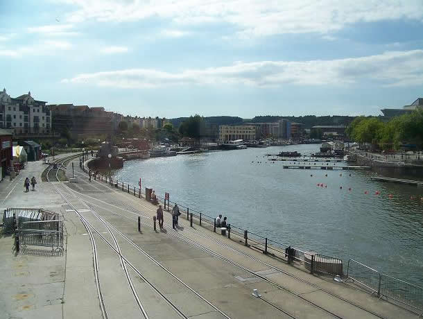 - (photo below /blue arrow) the Floating Harbour, view towards the gorge at Clifton to the West downstream with the rocks in the distance.