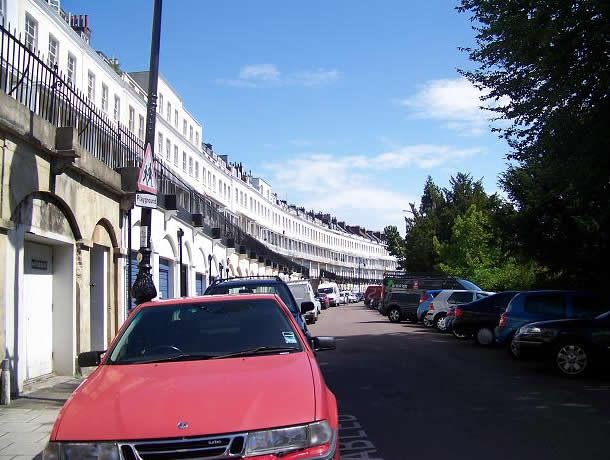 In Royal York Crescent (late 18th-early 19th century, photo to the right), on a slope, the lower floor is a basement, and a street runs above it; the first floor of the houses has balconies overlooking the city and harbour.